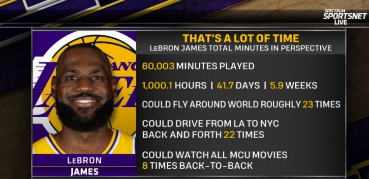 詹姆斯生涯至今出战60003分钟,可以换算为1000.1小时、41.7天、5.9周,能够坐飞机环绕地球23圈,能够开车从洛杉矶到纽约往返22次,可以连续8次观看《复仇者联盟》系列电影