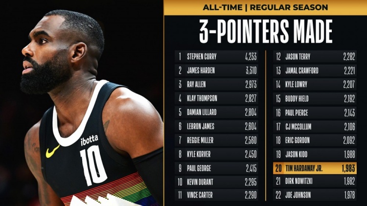 截至发稿,小哈达威三分7中5砍下19分。加上这5记三分,他的三分总数来到1984次,超越诺维茨基升至历史第20位。