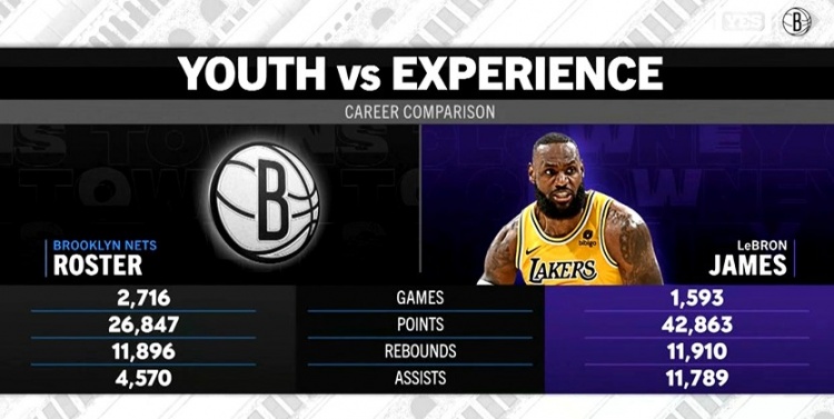 湖人客场挑战篮网,转播方晒出篮网全队和詹姆斯的数据对比,篮网全队的得分、篮板和助攻之和都没有詹姆斯的个人数据多。