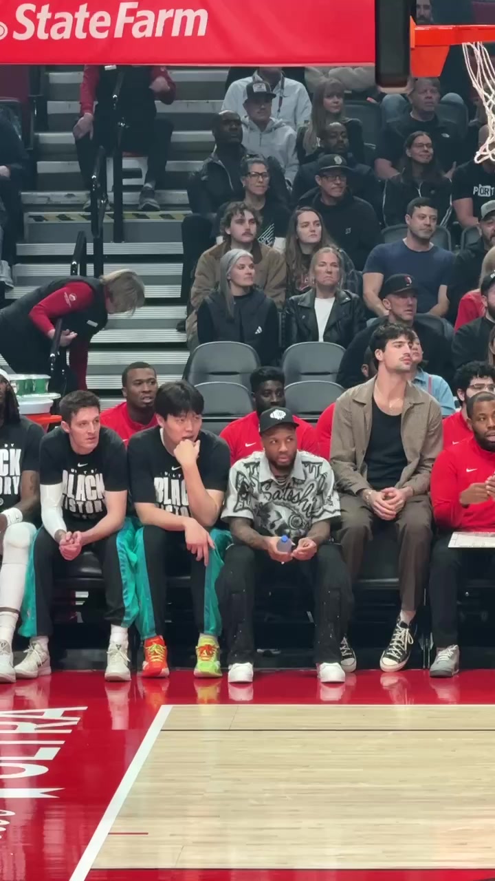 静静等待机会!小吧拍到杨瀚森坐在利拉德旁 认真观察场上局势