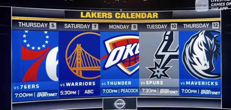 湖人媒体@PurpGolded晒出了湖人接下来5连主场赛程,他们将先后对阵76人、勇士、雷霆、马刺、独行侠。