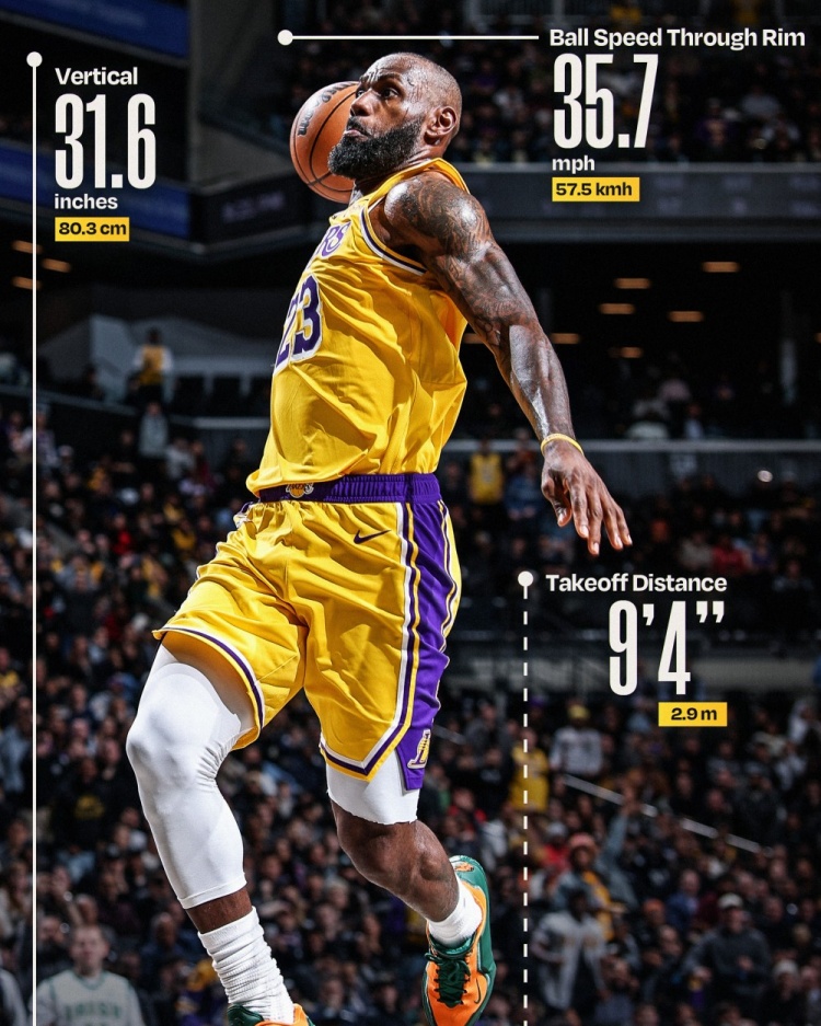 老詹今日对阵篮网暴扣垂直起跳80.3厘米&滑行2.9米 球过筐时速57.5公里(16米每秒)