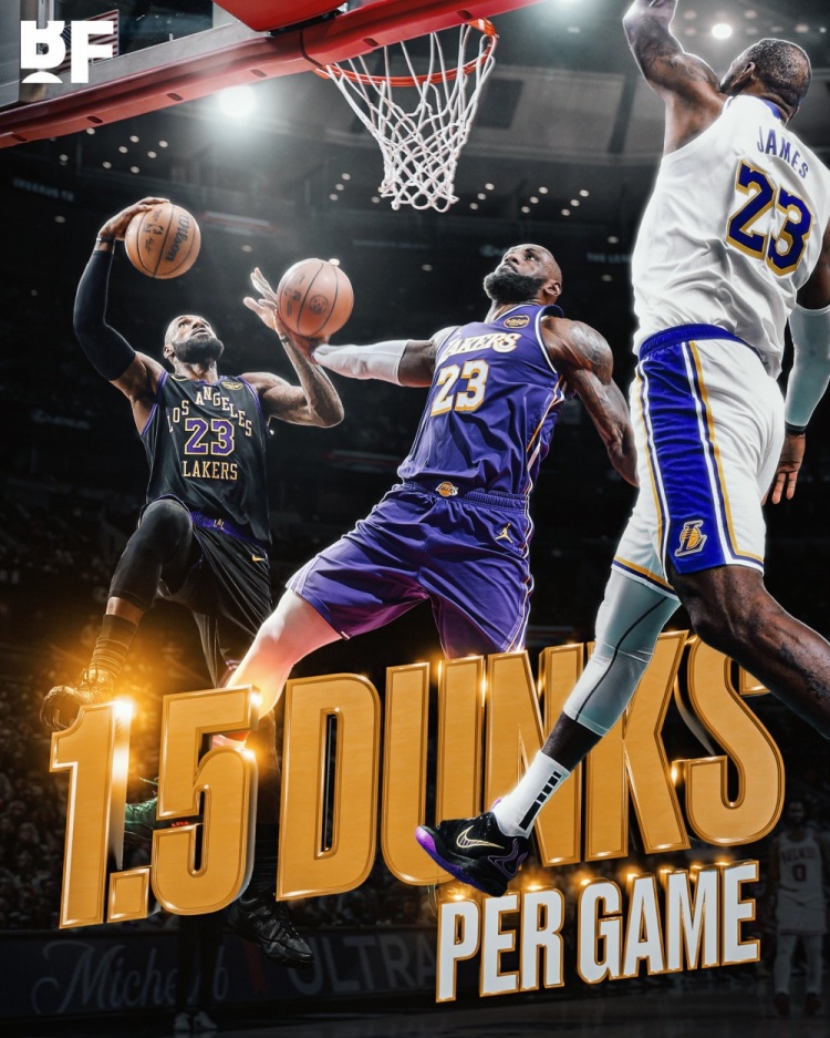 詹姆斯本赛季场均1.5扣篮;24-25赛季场均1.0次,23-24场均1.2次,22-23场均1.3次,21-22场均1.5次