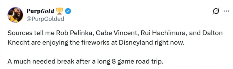 据湖人自媒体????????????????????????????????????报道,消息人士透露,佩林卡、文森特、八村塁和克内克特目前正在迪士尼乐园欣赏烟花表演。