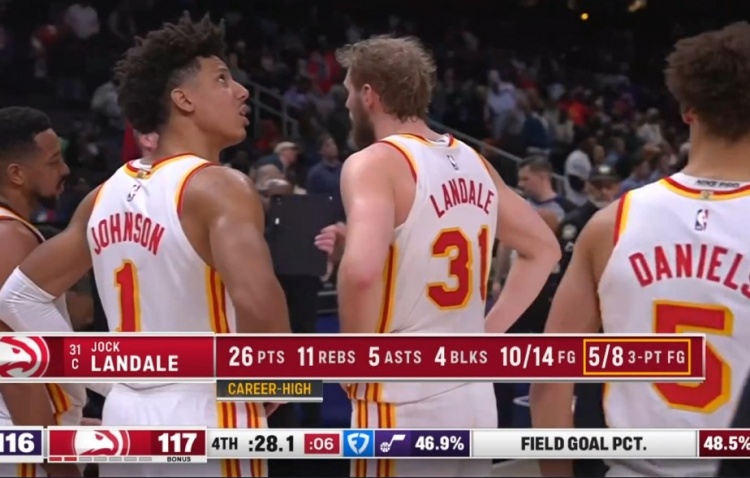 本场比赛,老鹰新援兰代尔迎来首秀,进攻十分高效并且外线神准刷新纪录(此前4球),在32分钟的时间里,投篮14中10,三分球8中5,罚球2中1,砍下26分11篮板(6前场篮板)5助攻4盖帽的数据,正负值+10。