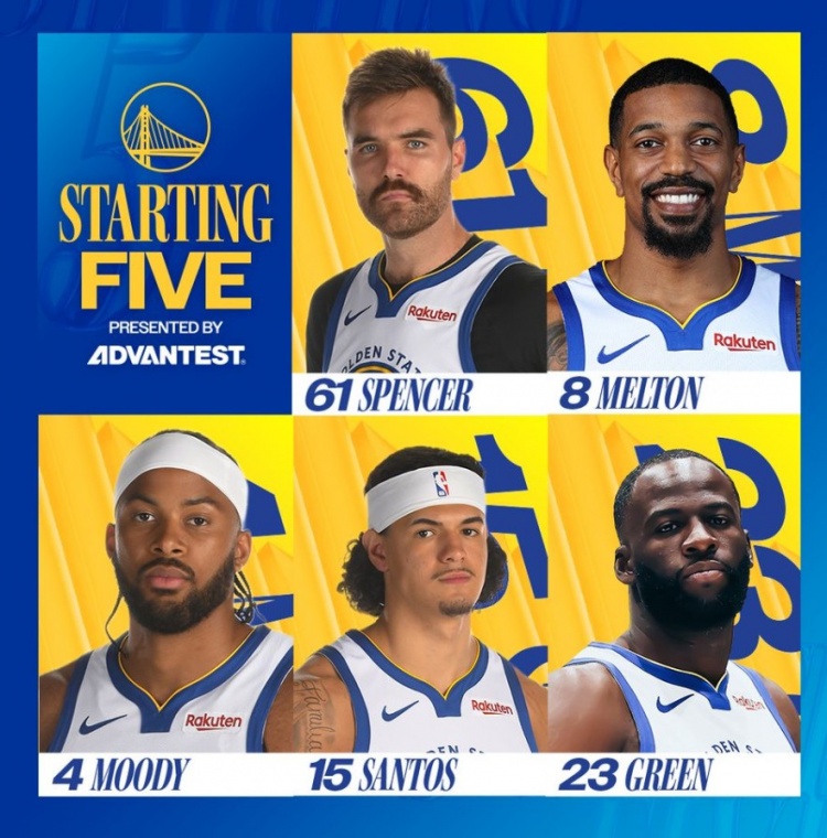 勇士首发:斯潘塞、梅尔顿、穆迪、桑托斯、追梦。