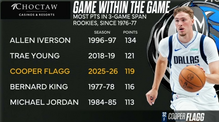 过去三场比赛弗拉格合砍119分,是自76-77赛季新秀连续三场得分之和的第三高,仅次于艾弗森和特雷·杨。