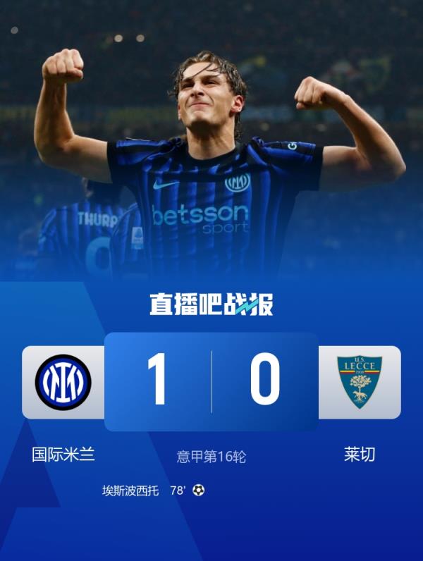 先赛6分领跑!国米1-0小胜莱切 埃斯波西托替补制胜国米近8轮7胜