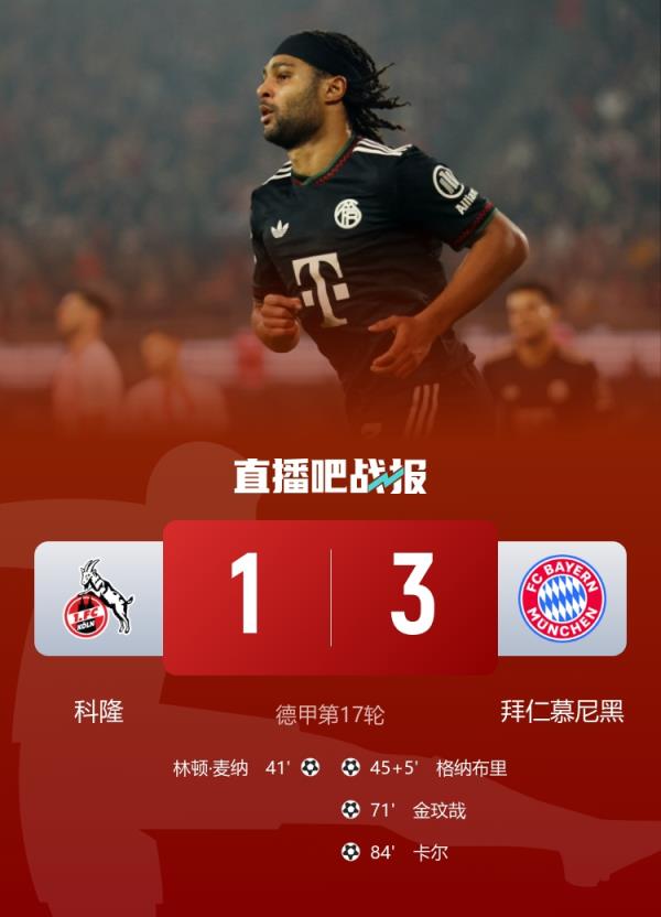 拜仁11分优势领跑,半程积分平队史纪录!格纳布里破门,金玟哉、卡尔建功。