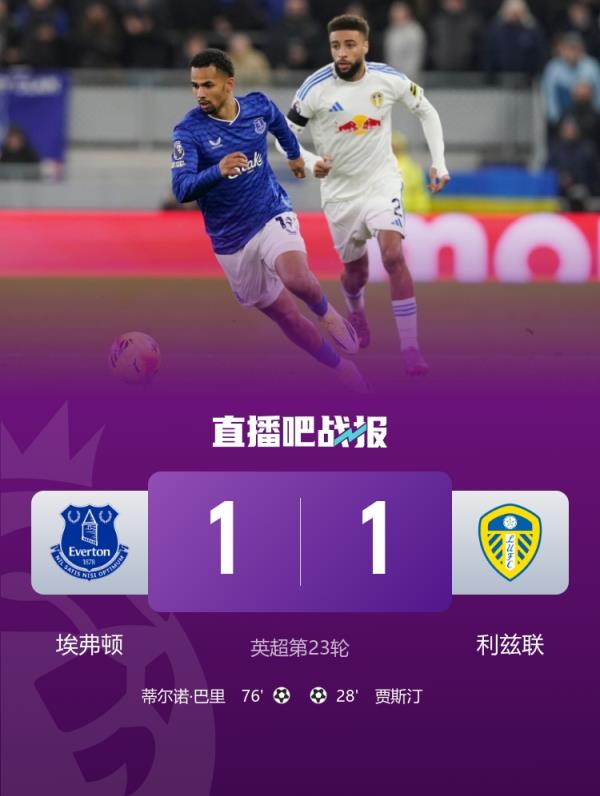 英超第23轮,埃弗顿1-1战平利兹联,贾斯汀破门,巴里扳平。