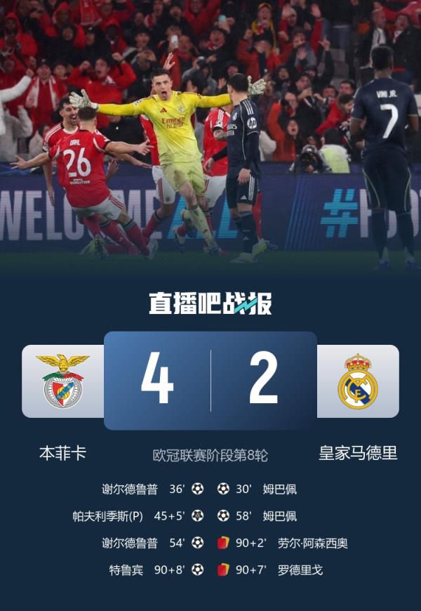 同轮次另一场比赛,葡萄牙体育在客场凭借第94分钟的绝杀,3-2击败毕尔巴鄂竞技,葡体因此积16分压哨晋级前八,而皇马则因此被挤出前八。