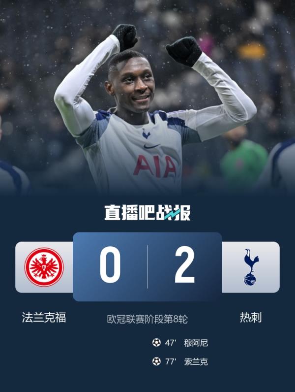 01月29日讯 欧冠联赛阶段第8轮战罢,热刺2-0力克法兰克福,以联赛阶段第4的成绩直通15强。球队在本届欧冠联赛阶段8轮5胜2平1负。