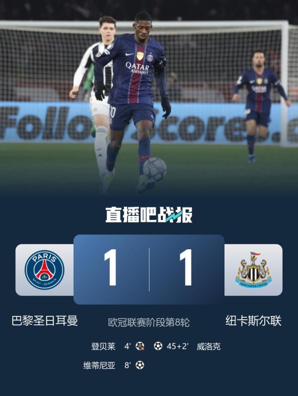 01月29日讯 欧冠联赛阶段第八轮, 巴黎1-1战平纽卡,两队均掉出前八,无缘直接晋级16强。