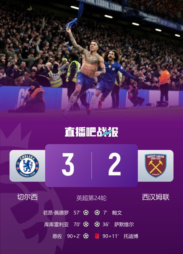 英超联赛第24轮,切尔西3-2逆转绝杀西汉姆联,恩佐补时破门。
