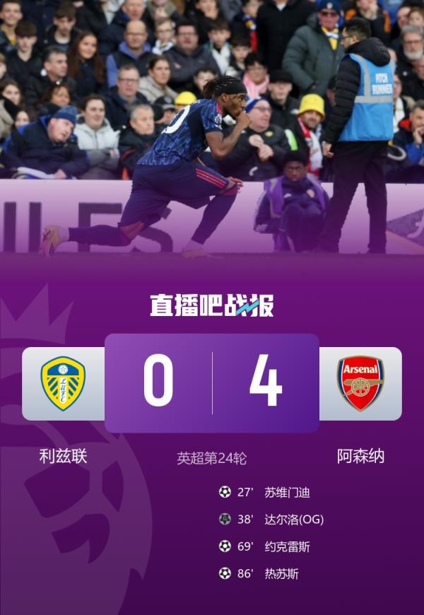 英超第24轮,阿森纳客场4-0大胜利兹联,约克雷斯破球荒,马杜埃凯造2球。