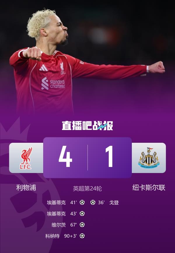 英超联赛第24轮,利物浦4-1逆转纽卡斯尔联,埃基蒂克梅开二度,维尔茨、科纳特进球。
