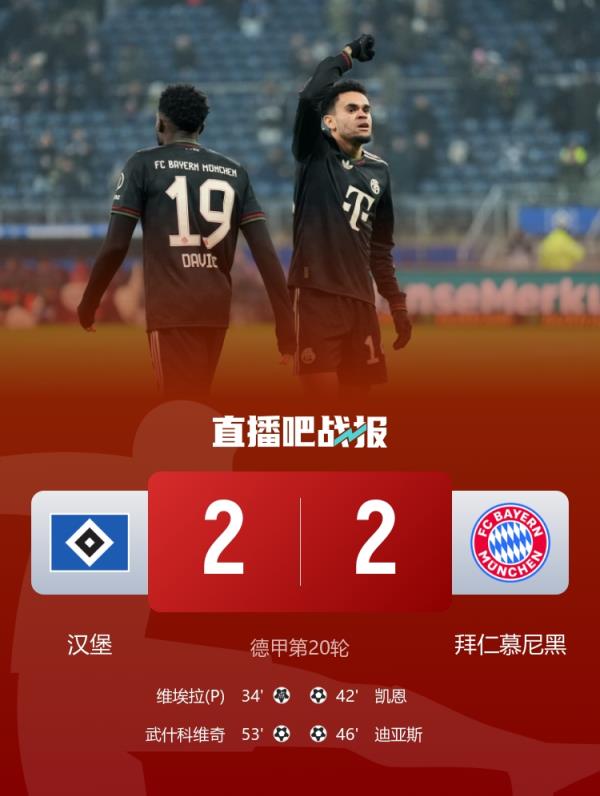 德甲第20轮,拜仁慕尼黑客场2-2战平汉堡,凯恩、迪亚斯进球。