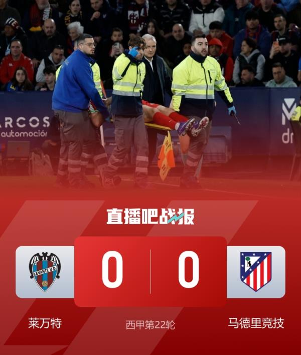 西甲第22轮,莱万特0-0战平马德里竞技,瑟尔洛特头部受伤。