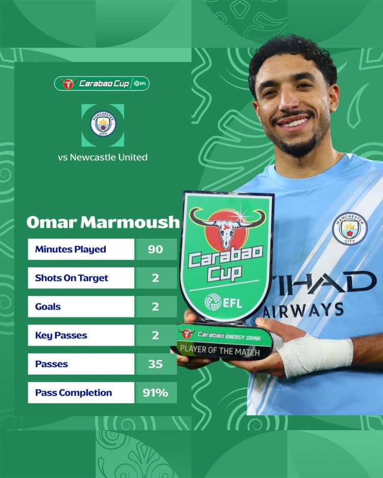 2月5日讯 在曼城3-1击败纽卡,总比分5-1晋级联赛杯后,马尔穆什当选本场比赛全场最佳。