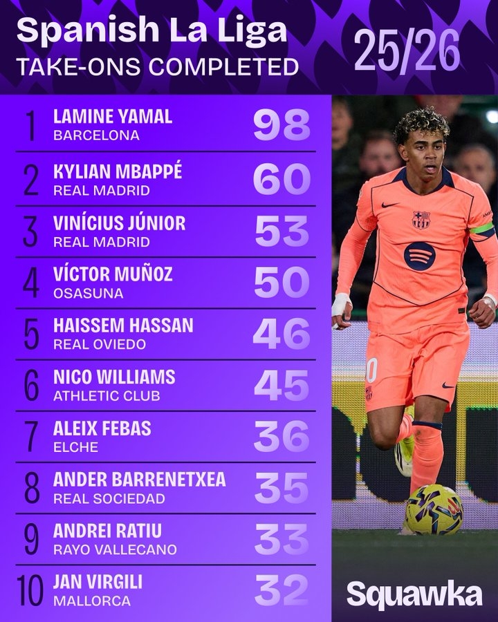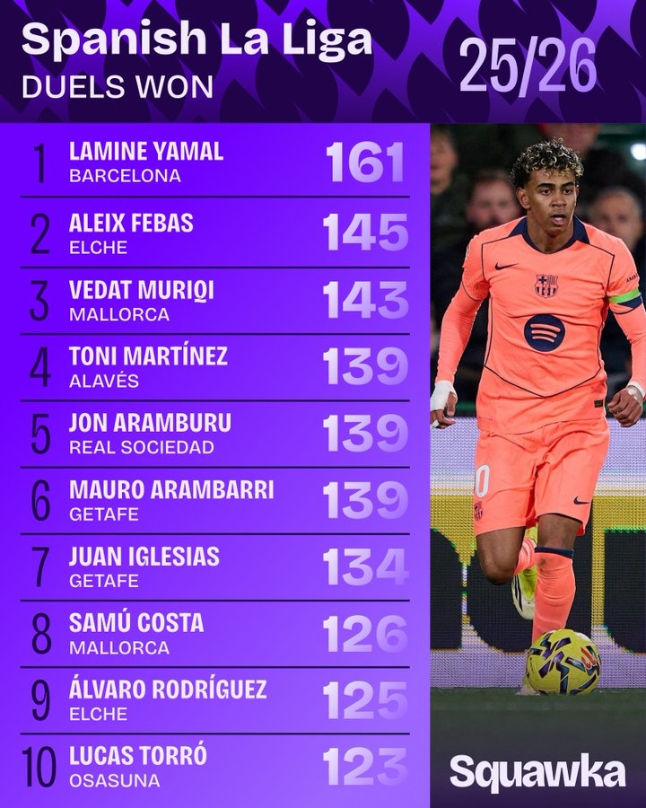 02月05日讯 截止西甲22轮,据Squawka统计,亚马尔在多项数据霸榜。