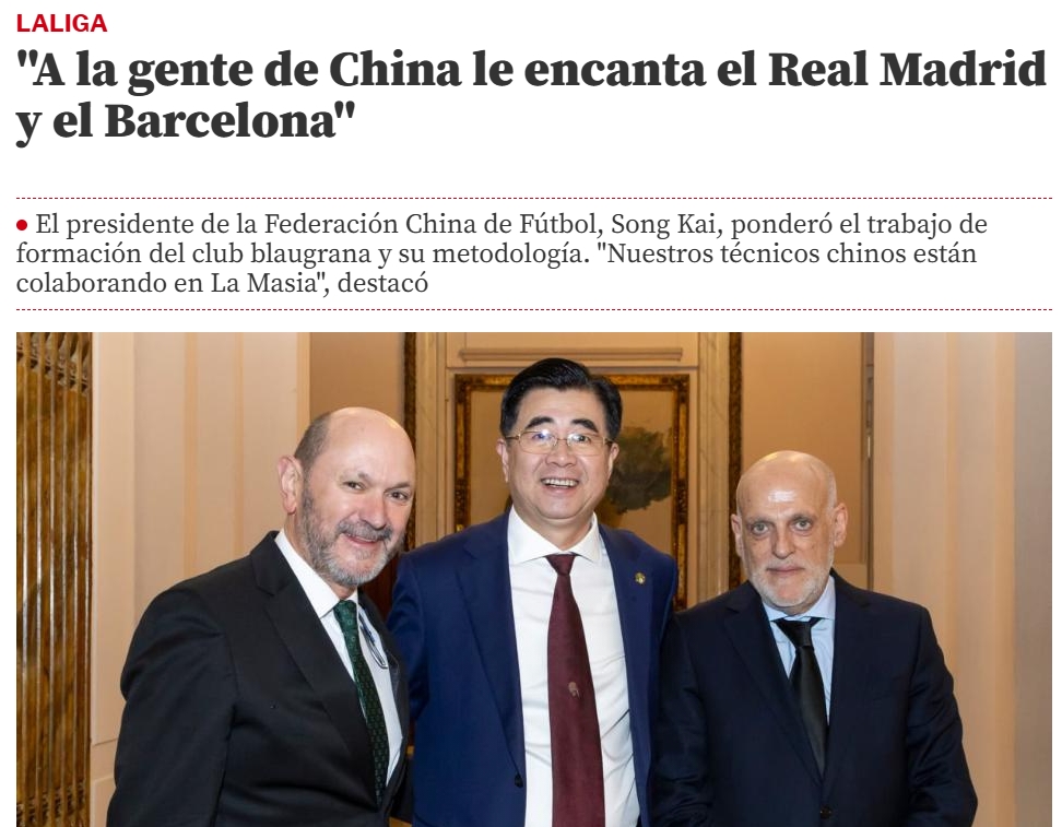 宋凯说:“中国人民热爱皇马和巴萨。为提升足球水平,中国政府已推出多项政策措施。我们在青训、基础设施方面取得进步,尤其是体育场和训练基地方面;足球公园和足球场数量不断增加。
