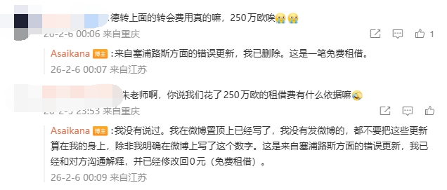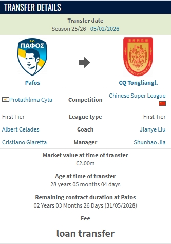 但据德转朱艺消息,迪马塔租借费250万欧是塞浦路斯方面的错误更新,现已删除,这是一笔免费租借。