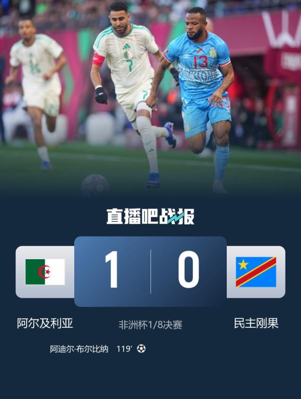 布尔比纳替补登场破门绝杀,阿尔及利亚1-0淘汰民主刚果晋级八强,将在四分之一决赛中对阵尼日利亚。