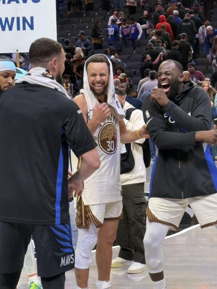 库里、追梦赛后与克莱场边聚首,三人看起来都非常开心。