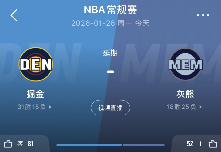 01月26日讯 ESPN名记Shams报道,原定于今日凌晨04:30分进行的NBA常规赛,灰熊主场对阵掘金的比赛,因天气原因延期进行。