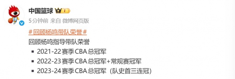 中国篮球官方微博晒出了杨鸣在辽宁男篮的执教荣誉,详情如下: