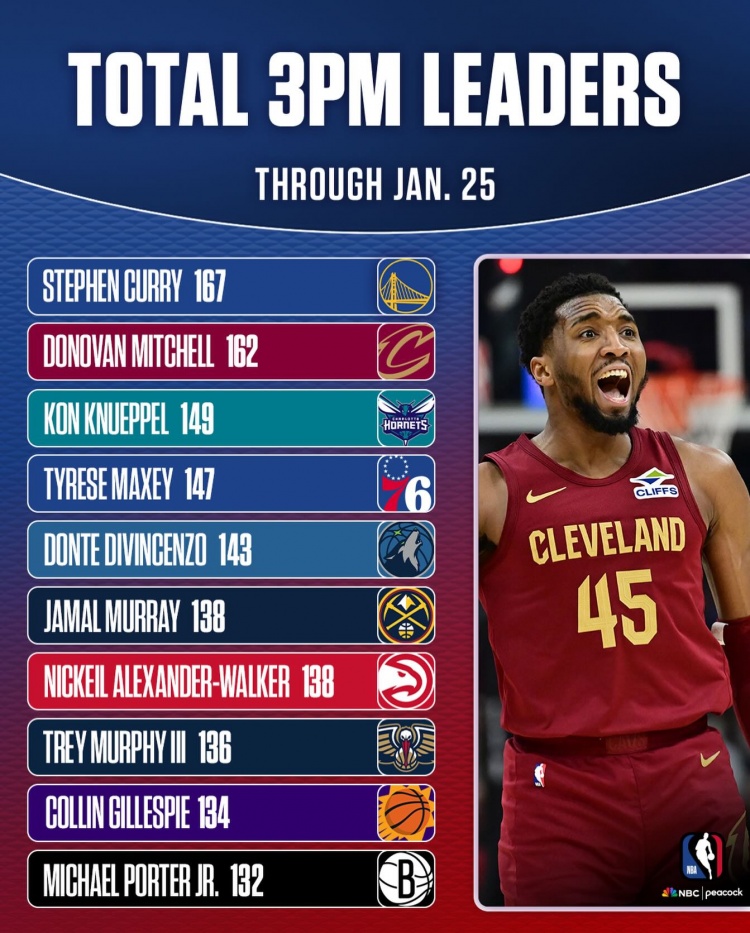 1月27日讯 NBC晒出了赛季至今的球员三分命中数排行榜。其中库里排名第一、米切尔第二、克尼佩尔第三。