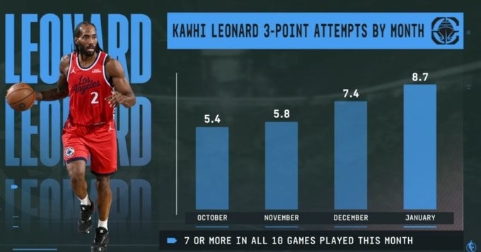 说到做到!小卡本赛季三分出手数逐月提升 近10场每场甩至少7个