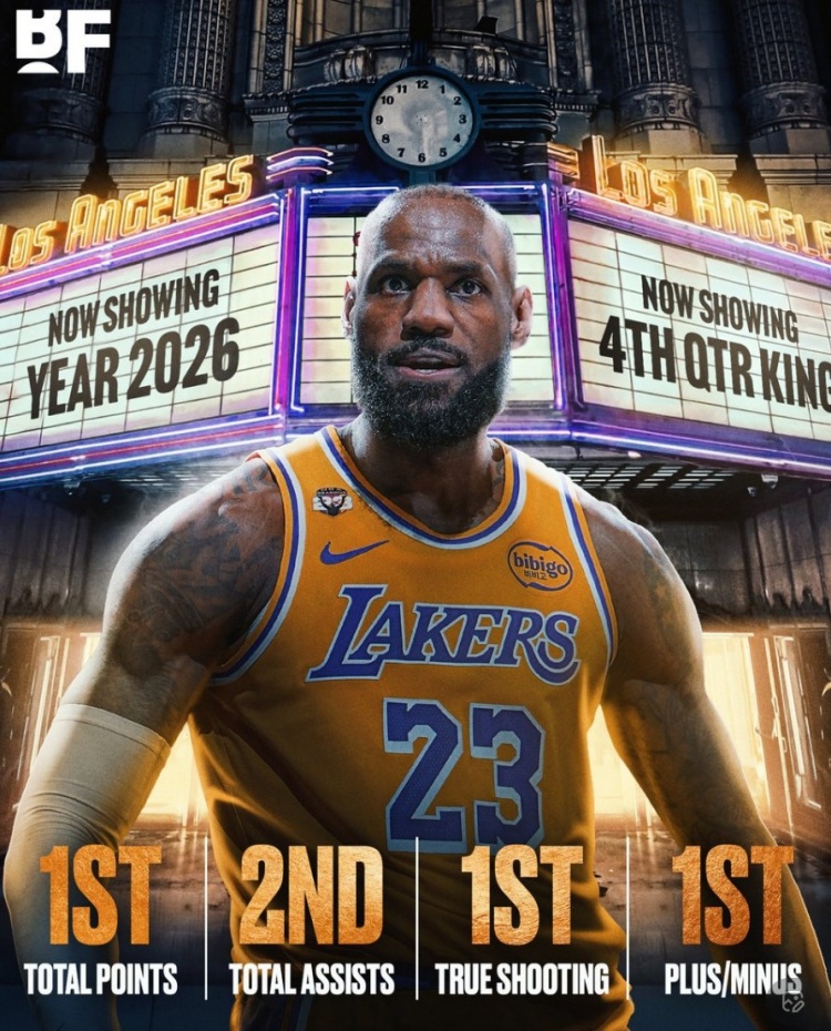 詹姆斯2026年末节的总得分、真实命中率和正负值皆联盟第一