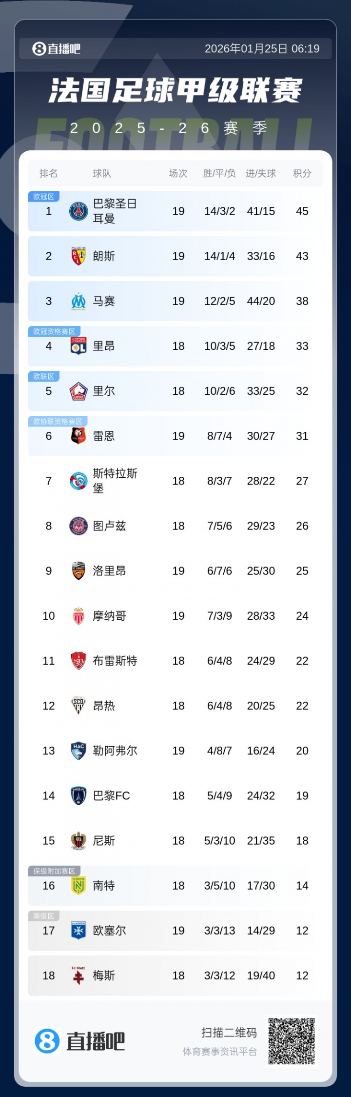 最新的积分榜方面:巴黎时隔多轮再次夺回榜首,目前2分领跑;朗斯本轮不敌马赛跌至第2名,马赛则是继续排名第3。