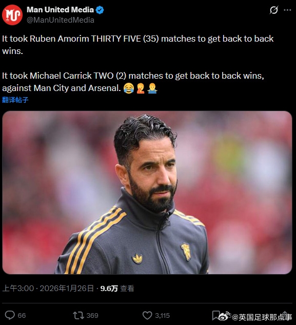 【炒晚了?】曼联球迷发帖:阿莫林用了35场比赛才取得连胜,而卡里克只用了两场,对手还分别是曼城和阿森纳。