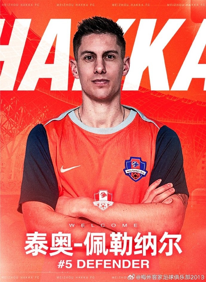 泰奥·佩勒纳尔正式加盟梅州客家足球俱乐部,新赛季身披5号球衣