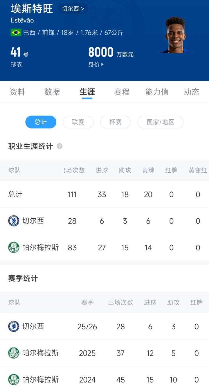 在去年夏窗以4500万欧元的转会费加盟切尔西后,本赛季埃斯特旺已经出战28场比赛,贡献6粒进球和3次助攻,目前18岁的埃斯特旺德转身价为8000万欧元,他与切尔西的合同将在2033年6月到期。