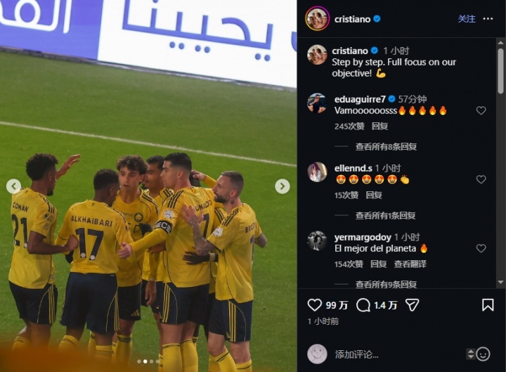 C罗发布了比赛图,并配文:一步一个脚印,全力专注于我们的目标!