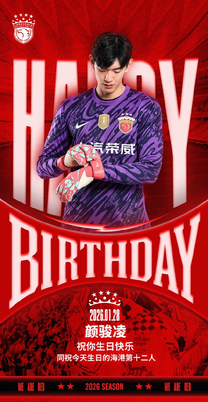 今天是海港足球俱乐部一线队球员颜骏凌的生日,让我们祝他生日快乐!同祝今天生日的海港第十二人~